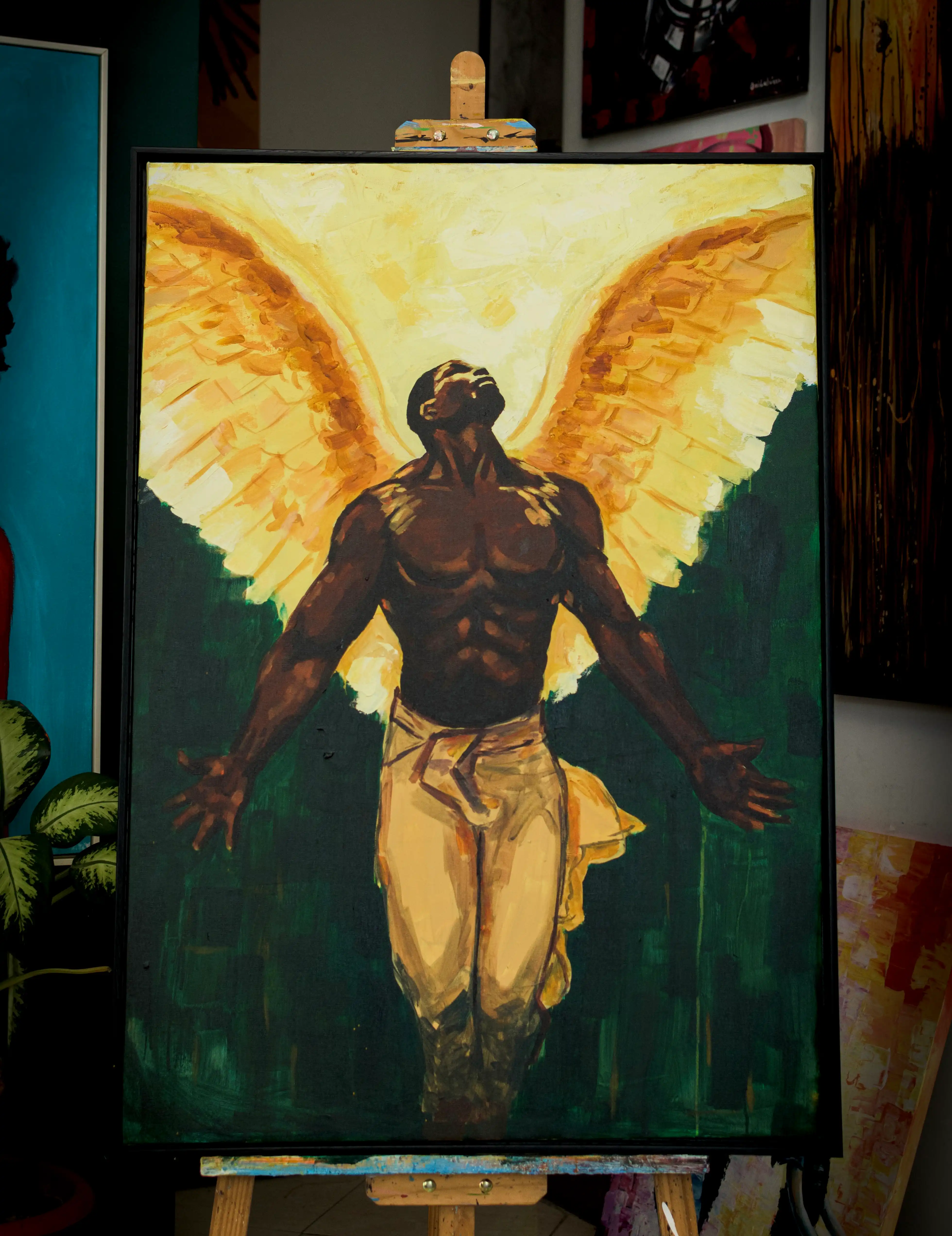 A powerful and evocative portrait that celebrates the beauty and strength of African features. This piece combines bold strokes with delicate details to create a striking representation of dignity and divinity.
